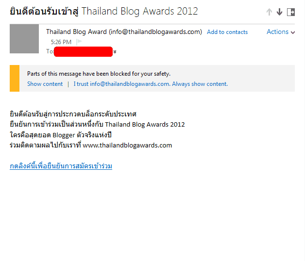 4. ลองตรวจสอบอีเมล์เพื่อยืนยันจากกล่องความขาเข้าของคุณ (บางครั้งอีเมล์ดังกล่าวจะถูกจัดเก็บไว้ในกล่องข้อความอีเมลขยะ) จากนั้นให้ทำการคลิกที่ ข้อความว่า ” กดลิ้งค์นี้เพื่อยืนยันการสมัครเข้าร่วม “